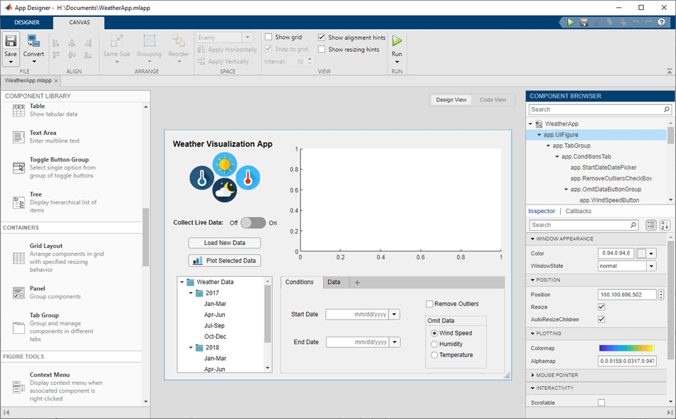 - App Building: You can use MATLAB to create desktop and web apps that interact with your users using graphical user interfaces (GUIs). You can also use MATLAB apps to see how different algorithms work with your data. [App Designer development environment in MATLAB]