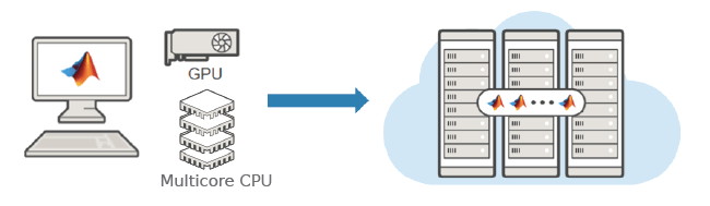 - Parallel Computing: You can use MATLAB to perform large-scale computations and parallelize simulations using multicore desktops, GPUs, clusters, and clouds. You can also use MATLAB to distribute your code or apps to multiple machines or devices. [Parallel computing graphics]